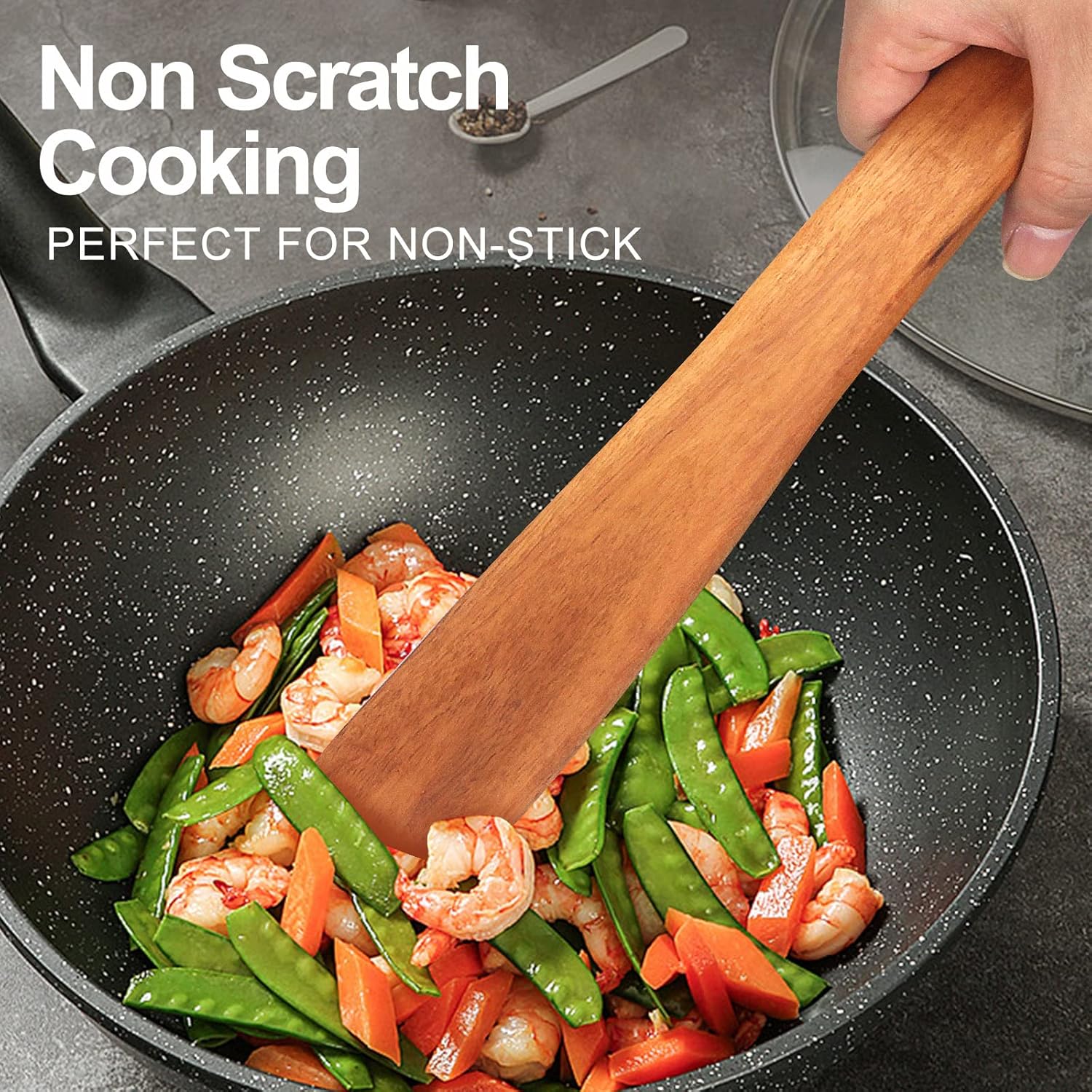 - Best Teak Wood:The wooden spatula is made of food-grade teak wood, its brown teak construction makes it pretty indestructible and does not seem to adsorb any of the cooking liquid once it is seasoned.