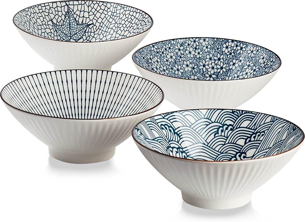 38 oz Japanese Ramen Bowls, Cereal Bowls, Soup Bowls, Pho Bowls, Noodle Bowls, Blue and White Ceramic Bowls Set of 4, 8 inches